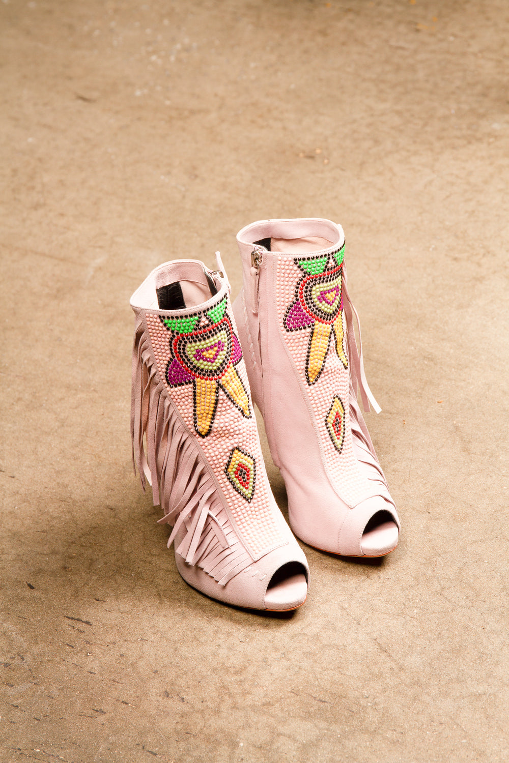 Giuseppe Zanotti pink suede booties featuring crystal and bead Inca-inspired detailing with fringe trim and an open-toe silhouette.