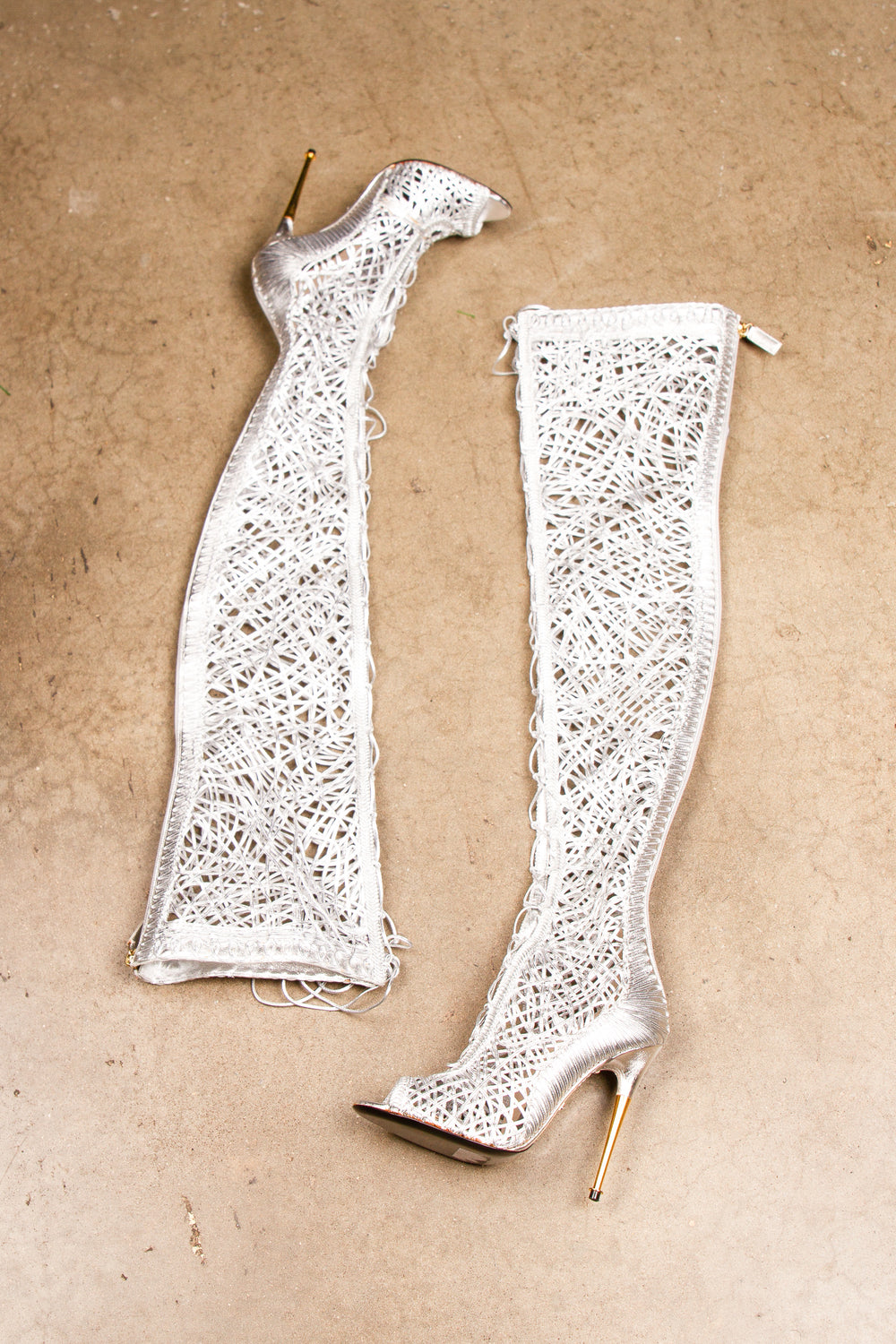 Tom Ford silver thigh-high boot from the Spring/Summer 2014 collection, featuring the signature laser-cut detailing from this runway season. A rare and highly recognizable Tom Ford statement piece.